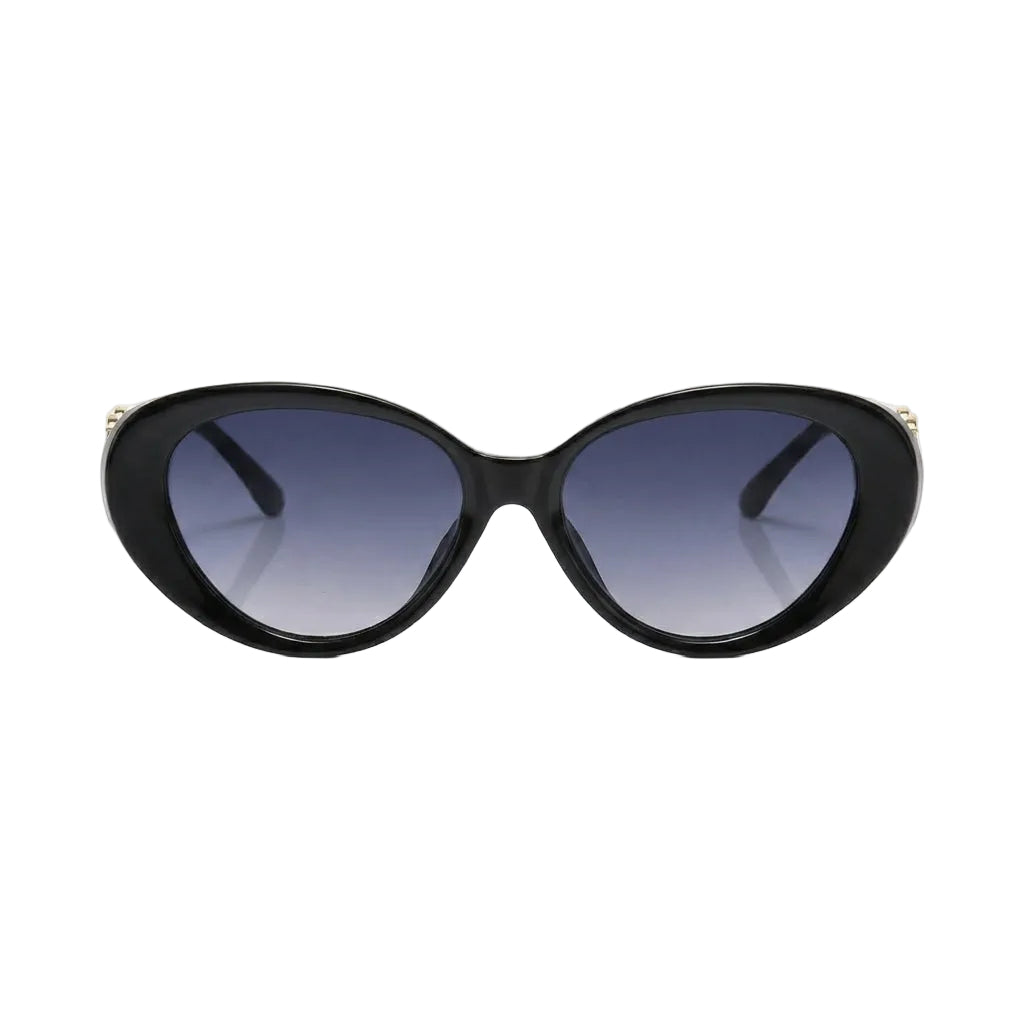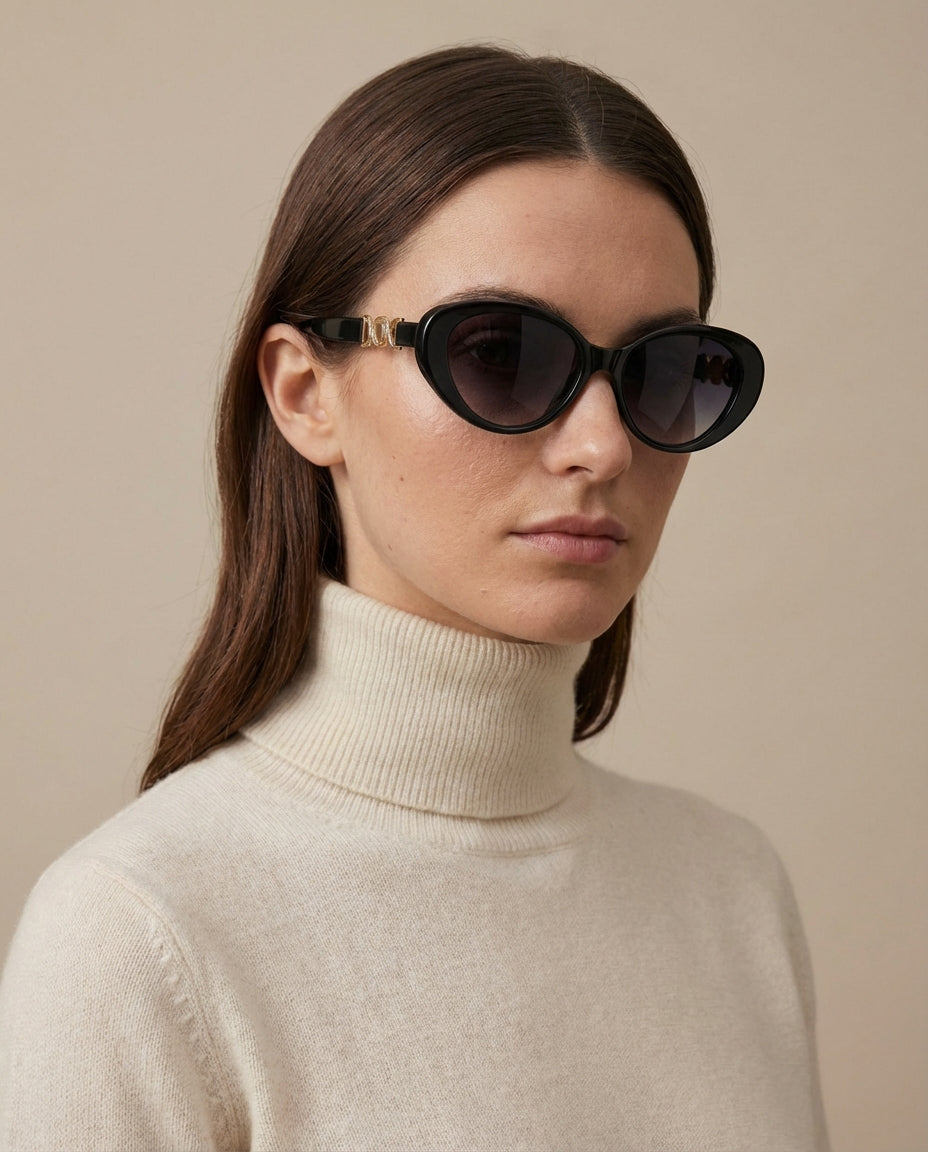 Celia is a celebration of refined femininity with a timeless Italian spirit. Defined by a softly sculpted cat-eye silhouette, this design enhances the face with gentle lift and elegant balance. The smooth black frame is elevated by distinctive gold-tone circular temple details, adding a subtle jewelry-like accent that feels both classic and contemporary.